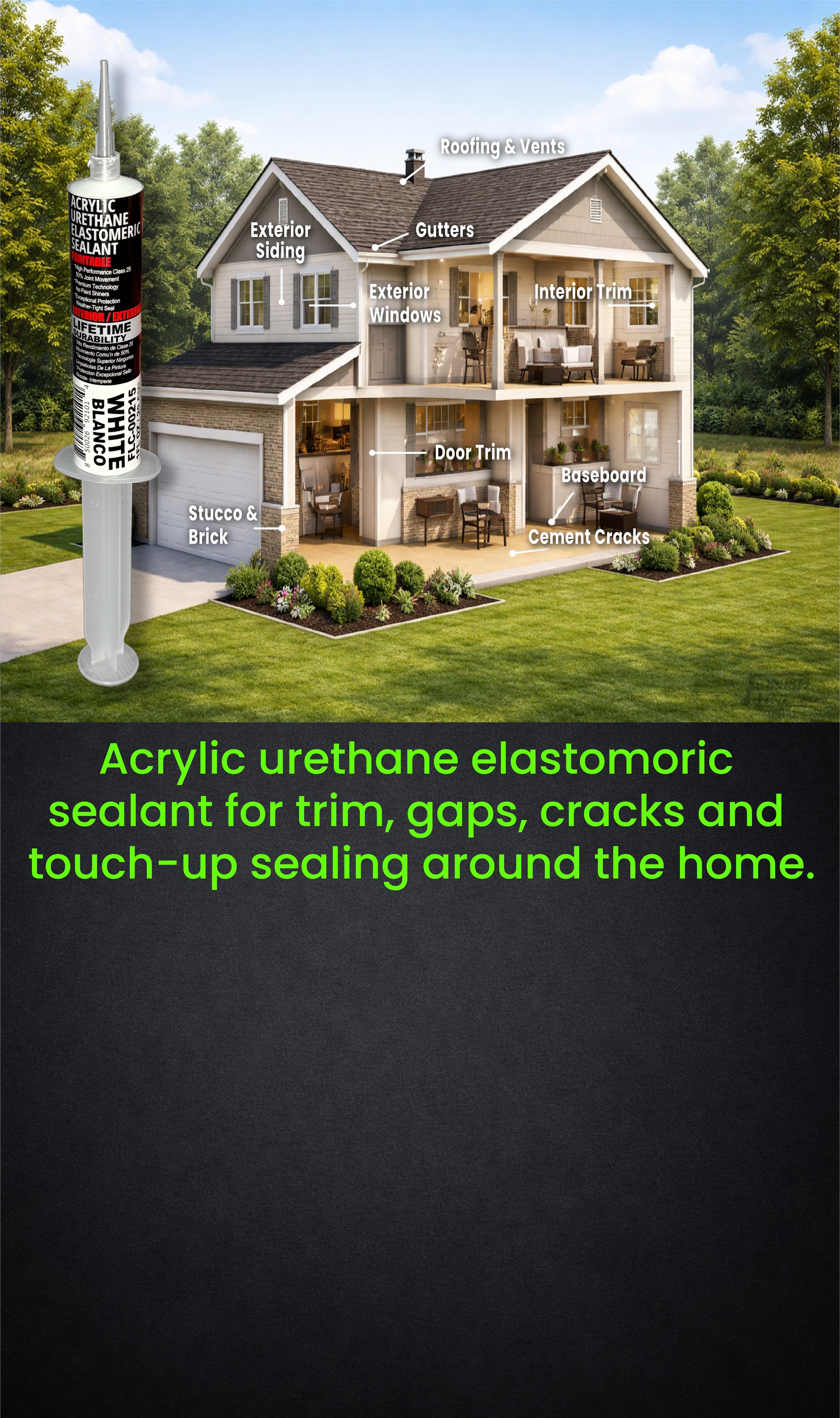Excellent adhesion to common building materials including wood, metal, vinyl, stucco, concrete, and masonry.